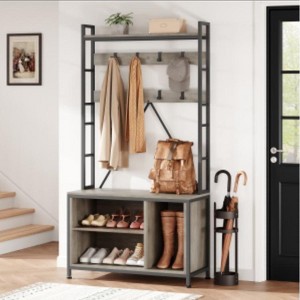 The grey PB+metal panel hall tree offers practical hanging space with a modern look. Sturdy and compact, it is perfect for entryways, keeping daily accessories organized while complementing home decor.