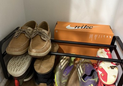 This shoe rack was super easy to put together. It can be used as a single unit, but also comes with screws if you would like to purchase more than one and stack them. I got this for my son‘s closet. He wears a size 9 in men’s the shoes fit under the rack and on the rack nicely if you have a lot of high top shoes or boots the width of this shelf would not be ideal. Regular sneakers, cleats, slides, and other shoes fit on it very well! Our space is tight. The rack is extended a little bit but it gets wider than this.
