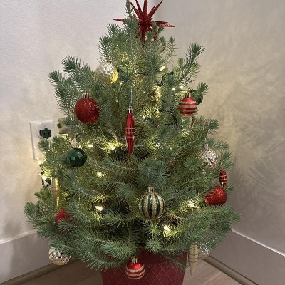 Adorable tree and smells great. Great option if you don’t want a huge tree in your place. Purchased mini ornaments, 50 string lights, and a red star ornament that was used as a makeshift topper. Everything was from Target!