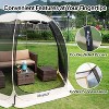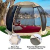10 by 10 Alvantor pop up tent. black screens for sun protection. Durable material. Sand bags,stakes and attached rope to tie down and hold in place from wind.Best ever I love my tent. I can now sit outside without bugs attacking me and this is better then paying out thousands of dollars for a closed-in porch