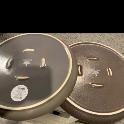 Serve entrees in style on this 10.75-inch Stoneware Tilley Dinner Plate from Threshold™. Made from microwave-safe stoneware for easy reheating, this dinner plate feature a classic round silhouette with slightly raised edges for easy scooping. Featuring a slightly distressed glazed finish this round dinner plates bring a striking update to your tableware. Great for serving a variety of snacks, finger foods or your favorite recipes, they're just the right pick for everyday meals or entertaining. Plus, the dishwasher-safe design makes cleanup a breeze.