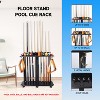 The floor stand billiard pool cue rack is made of solid wood, has a furniture-grade paint finish, and requires simple assembly. The pool stick stand cue rack holds up to 10 pool cues, a complete set of pool balls, 2 cup holes, and has 2 metal hooks that can hang pool ball racks.