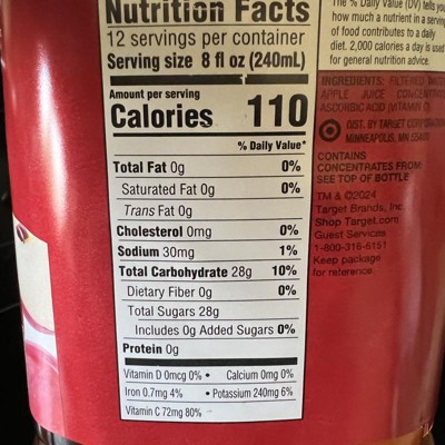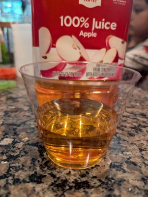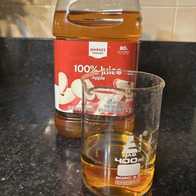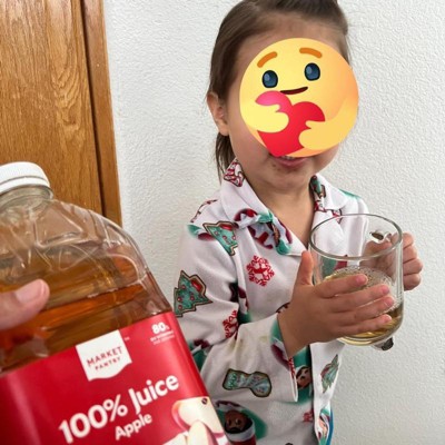 [This review was collected as part of a promotion.] This is the market pantry apple juice. The container is larger than most juice, at 96 ounces. The price is pretty good for the amount and the quality. There is not any grams of added sugars, and there are twelve servings in the container. The flavor is comparable to any other apple juices. This contains 100% apple juice. It tastes the best chilled rather than room temperature. I received an incentive to write this review.