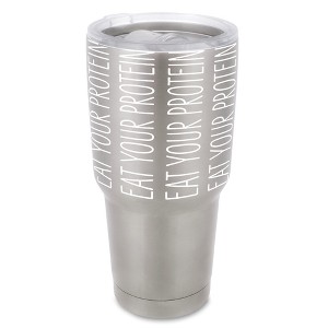 HYDRATE IN STYLE - These fashionable tumblers have a ton of personality!; Presents sentiment "Eat your protein"; THOUGHTFUL DESIGN - Made of premium quality stainless steel for long-lasting durable drinkware; Splash resistant lid with silicone gasket to keep beverages temperate and prevent leaks; FITS IN MOST STANDARD CAR CUPHOLDERS - Tapered bottom allows tumbler to fit in most cupholders for easy travel; Each tumbler holds 30 ounces of your favorite hot or cold refreshment; EASY CLEAN & CARE: Dishwasher safe for ease of cleaning; Do not microwave; Contained in protective packaging; Ready for easy gifting for any occasion
