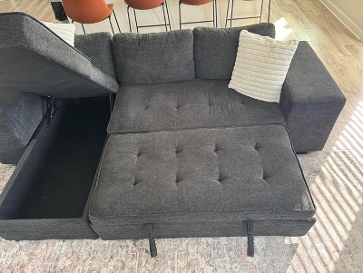 The couch was amazing. I assembled it with one other person which was easy to do. The size is perfect! As you can see, I love to pull out the couch in the evenings to watch tv or to game. The hidden storage is perfect for extra pillows and blankets that I have. Super comfy for me and for my cat.