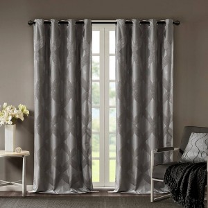 Combining luxe style with functionality, our Byron Ogee Knitted Jacquard Total Blackout Panel is the perfect update to dress any window. An ogee knitted jacquard design is featured in a rich hues, creating a luxurious sheen and texture. The heavy fabric uses a foamback and bonding finish enhancing the panel to block out all sunlight, provide a maximum protective barrier against noise intrusion, and offer a maximum level of privacy and energy savings. A silver grommet top finish makes it easy to hang, open, and close panels throughout the day; fits up to a 1.25" diameter rod. With 100% total blackout properties, this window panel is the perfect addition for bedrooms, media rooms, or any private spaces, giving your home a lavish and contemporary appeal. Lighting level: Pitch Black Ambiance.