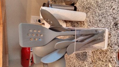 This modern utensil set is just what I was looking for! The dark gray color matches our kitchen backsplash tile perfectly, and the material is great for ceramic cookware.