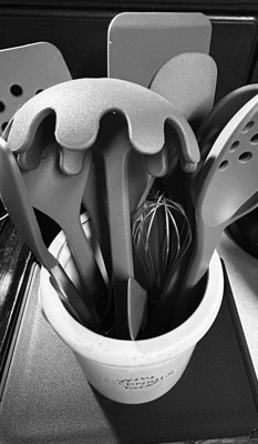 A: The utensils are designed in a black color to easily match any kitchen decor.