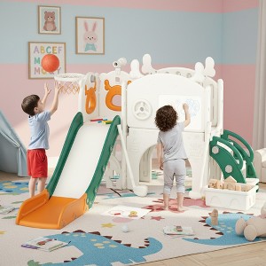 - All-in-One 11-in-1 Activity Center – More than just a slide, this Elk-themed playset combines sliding, climbing, golf, basketball, steering wheel, telescope, crawling tunnel, hide-and-seek hole, storage, and more to create a complete indoor & outdoor playground for toddlers.