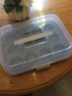 This muffin pan with lid is so incredibly useful! The pan holds 12 muffins or cupcakes. It cooks things evenly and cleans up really easily. The lid just snaps onto the pan you used to cook with! So much more useful than a whole separate contraption that only carries the cupcakes/muffins! When storage space is limited it's little things like this that make be happy. There is plenty of room between the pan and the lid for a lot of frosting so you don't have to worry about cupcakes getting smooshed. The handle makes carrying easy. I love this set!