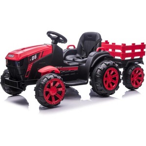 Electric Kids Ride On Tractor with Trailer, 12V Battery Powered Car Vehicle Toys with Remote Control, Dual Motors, Led Lights, Music, Startup Sound Gift for Boys Girls 3-7, Red