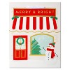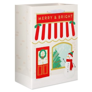 - This large American Greetings Christmas gift bag features a storefront scene with a snowman and festive decorations.