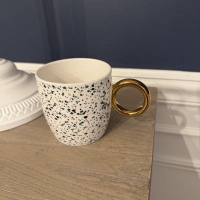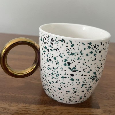 [This review was collected as part of a promotion.] The gold circle handle on this my is probably my favorite feature. It’s very unique, shiny, and hasn’t tarnished through a couple dishwasher cycles. I’m hoping it holds up over time as well as it already has. The splatter print consists of a dark green and black. It kind of looks like Eagles colors if you’re a football fan! Overall a good mug and does the job well. I received an incentive to write this review.