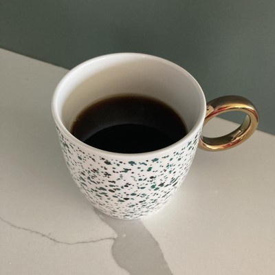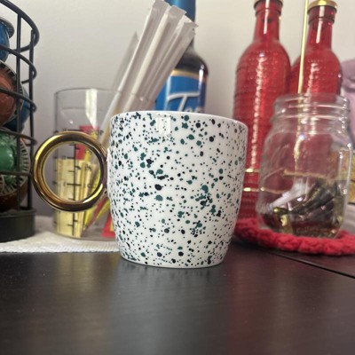 Enhance your coffee routine with this Spatter Print Mug from Room Essentials™. This coffee mug features a woodsy green splatter pattern on a white backdrop to infuse color and whimsy into your mug collection, and it boasts a ring-shaped handle for an elegant touch. Made from stoneware, this 13-ounce mug is great for sipping hot and cold beverages — from iced tea to freshly-brewed coffee — and it's both dishwasher and microwave safe for quick cleaning and reheating.