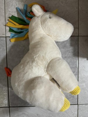 - Soft plush construction in white with multicolor stretchy jersey mane and tail
