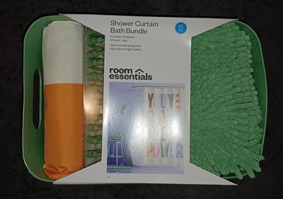 'You've Got The Power' Shower Curtains Green by Room Essentials was the perfect bathroom set for me. It contained everything I needed, a cute graphic shower curtain, curtain hooks, a fluffy bath mat that is highly absorbent and a neat storage tray to sit upon myself. I love the cool funky colored palette of this set. It's so unique, and such a conversation piece. Every item inside this kit feels durable and of great quality, like it will last for a long time. It gave my bathroom a jazzy and snazzy quality that was so needed, because it looked so dull before. The word graphic printed on the shower curtain is great motivation to get up and get going in the morning. I highly recommend this 15-piece set.