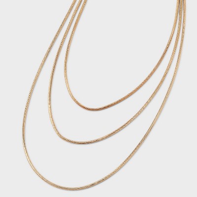 Get a layered jewelry look with ease with this 16-Inch Layered Curb Chain Necklace from A New Day™. Featuring three different thicknesses of chain in a shiny gold finish, this three-layer gold chain necklace makes it easy to create a coordinated look that instantly elevates a plain tee or a variety of other outfits. A lobster claw clasp closure makes for easy fastening at the back, and the shiny gold finish pairs perfectly with casual and dressy looks alike.