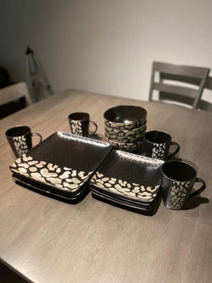 16pc Stoneware Wild Pattern Square Dinnerware Set Black - Elama: Animal Print Dishware Set, Service for 4, Microwave & Dishwasher Safe
