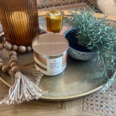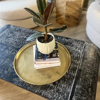 - Gold-finish round decorative tray lends a touch of glam to your tabletop
