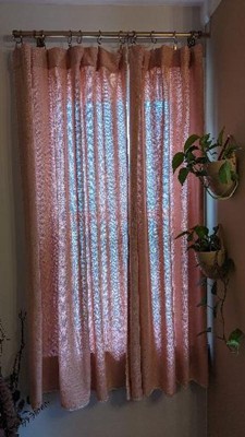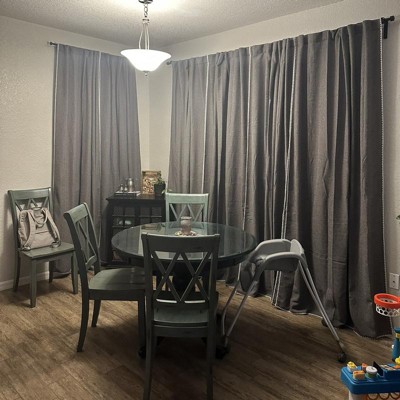 The gray version has a bit of a green tint, which I absolutely love, but beware if that’s not what you’re going for. It’s a simple design and provides a good amount of privacy without being blackout. The texture is nice and the back tabs allow for easy sliding on the curtain rod.