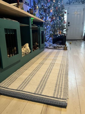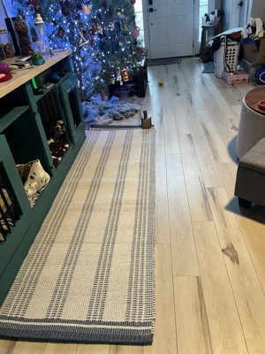 I have an obsession with buying rugs and this one did not disappoint! I love it! I originally used it in front of my dogs kennels but decided I wanted it to run next to the side of my bed. I love the feel of it when I get up. It lays flat and stays in place. The style is so simple.