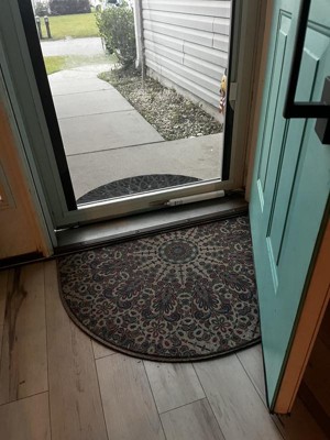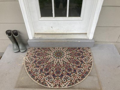 A: The doormat is designed in a half-round shape, providing a unique look.