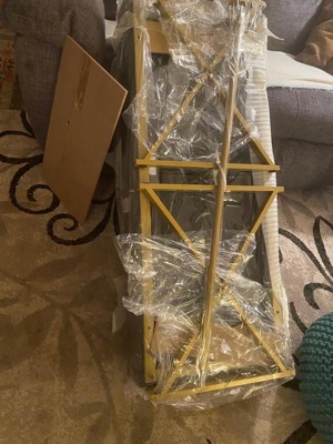 The gold color is much more of a metallic deep yellow, almost a mustard color. Assembly was very quick, however, the support bar that goes between the two X-legs needed to be tightened with a wrench to get it to stop wobbling, so make sure you have one handy