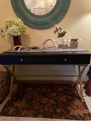 [This review was collected as part of a promotion.] This desk has such a sleek and stylish look with the black table top and gold legs that it can honestly be used for multiple things in fact that was my problem first I was going to use it as a laptop work desk but then I thought it looked too chic and I wanted to show it off a little bit so I use it as an entryway table. My wife wanted to use it as a vanity like I said it could be used in multiple ways.There are two drawers which would be great for papers,makeup or right now for me keys,mail and other front door needs. Assembly was a breeze. If you’re looking to dress up an area or just for a work desk or for other needs you can’t go wrong with this one.