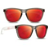 - Set features 1 pair of crystal frames paired with polarized green mirror lenses and a pair of grey frames with polarized orange mirror lenses