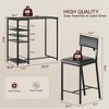 This two-person bar dining set includes one table and two chairs, designed specifically for compact kitchens, breakfast nooks, and similar spaces. The upholstered chairs feature ergonomic backrests and high-density foam padding, each supporting up to 330 lbs. The table incorporates a four-tier storage shelf underneath, allowing chairs to slide fully under when not in use. The reinforced metal frame and moisture-resistant tabletop ensure durability and easy cleaning. Simple assembly makes this an ideal choice for storage, comfort, and space optimization.