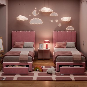 2 Sets Twin Bed Frame with Under-Bed Drawer, Upholstered Platform Bed with Wave Headboard for Kids/Girls, Wooden Slats Support, No Box Spring Needed