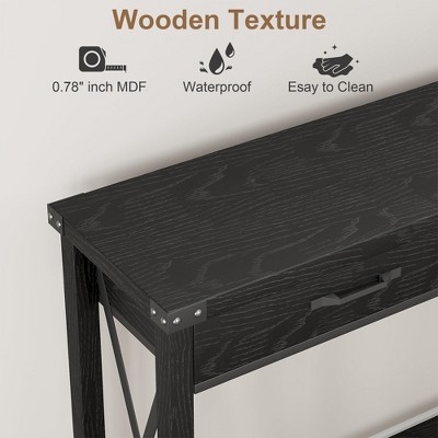 2-tier console table with wooden legs (MDF construction) in black. Sleek design fits entryways, hallways or bedrooms. Spacious top & lower shelf provide ample storage for essentials. Sturdy build ensures durability¡ªeasy to assemble, complements modern/minimalist decor.