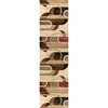 - Shades of brown, cream, red and green form bold, geometric stripes and arches pattern