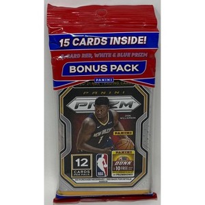This cello pack contains 2020-21 Panini Prizm basketball cards. It features red, white, and blue Prizm parallels.