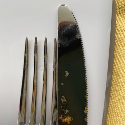 Pure garbage. If I could give zero stars I would. After only 1 washing a knife started to rust. Within a couple more washings, all the knives have rust marks and the forks have started rusting. No, that is not stuck on food in the picture