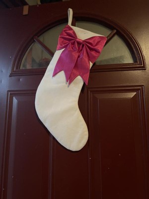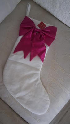 Cute stocking! Great size, soft and nice and white. The bow is a very pretty bright pink. I would actually rate this a 4.5/5. Deducting only because the bow isn't absolutely perfect...but, I am a serious perfectionist so, probably not an issue for most, and I'm sure every stocking is a little different. It definitely won't cause me to return it.