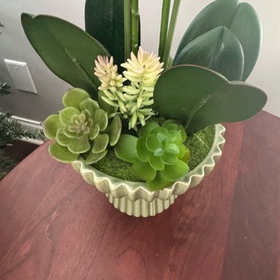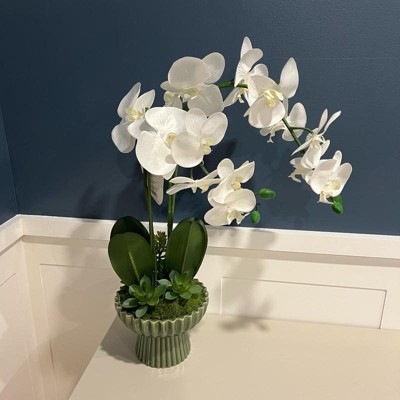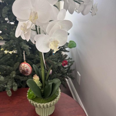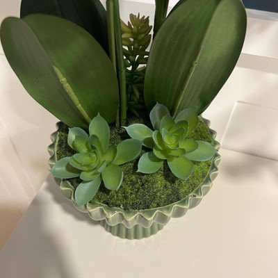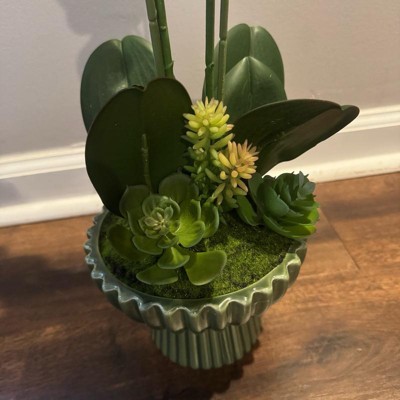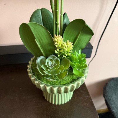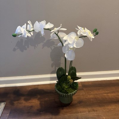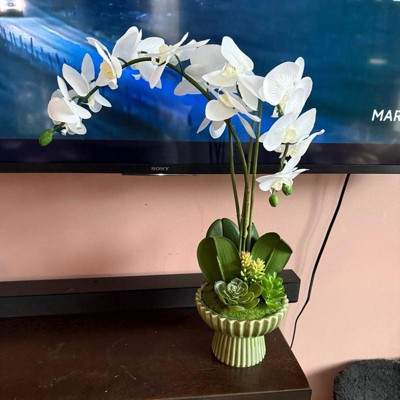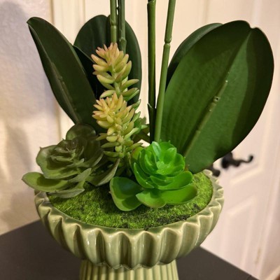 [This review was collected as part of a promotion.] This 22 inch elevated orchid plant by threshold is so beautiful and very realistic looking. There are also a few succulents in the bottom of the vase, which is green and has great detail around it. This would be amazing for anyone who loves or goods, but can't keep them alive like myself . This is a very full plant of flowers and buds.