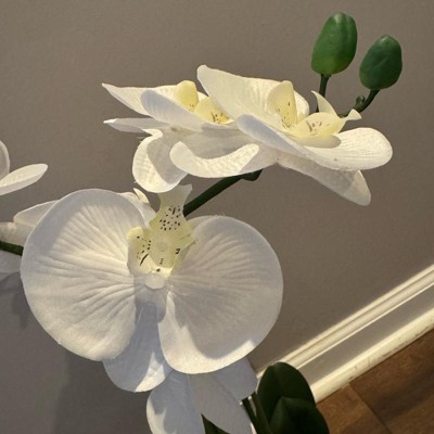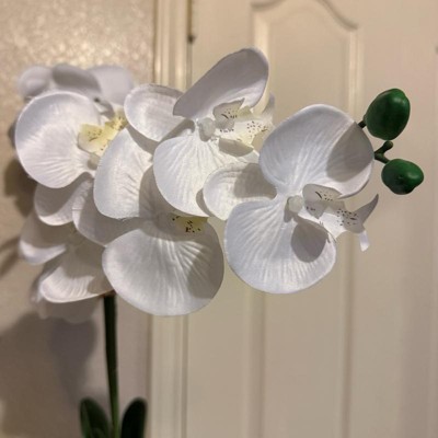 [This review was collected as part of a promotion.] The Elevated Orchid Plant is a pretty decorative piece for your home. From afar the orchid flower petals look real and have a bright white appearance. The piece is large so make sure to measure based on the measurement provided for the piece and for the space you are looking to put the piece to ensure it will fit as desired.
