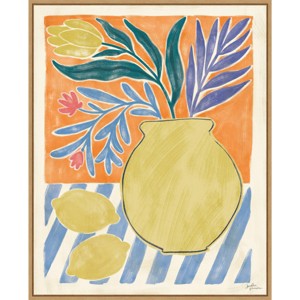ART DESCRIPTION: A pale yellow vase holds a large yellow flower and clusters of slender blue and green leaves. The vase sits on a blue striped table next to a pair of yellow lemons. An orange background appears behind the table and the vase. This Amanti Art canvas art print was created by Janelle Penner and printed by Amanti Art in Madison WI. The canvas is stretched by hand and finished with a float frame. Individually made using traditional custom framing techniques, it has the quality you would expect from your local frame shop. Because of our attention to detail and focus on artistry, architects, interior designers, and homeowners alike choose this framed canvas artwork to create beautiful living spaces.