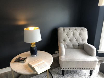 I love this lamp. The colors pair well together and it produces a soft, golden light after reflecting off an interior gold backing in the lamp shade.