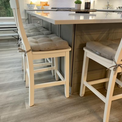 Chairs are perfect height for our kitchen island. Color is white, not bright white. They are sturdy and seem to be holding up well (just a few dings from toddlers) The directions to put them together was extremely confusing though. Overall I am happy with this purchase.