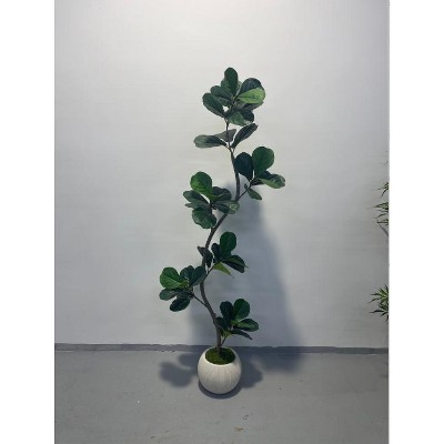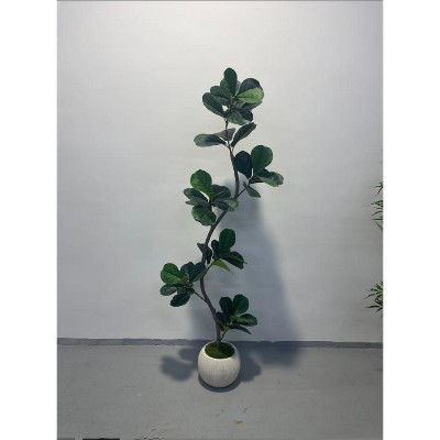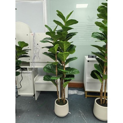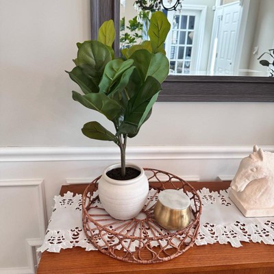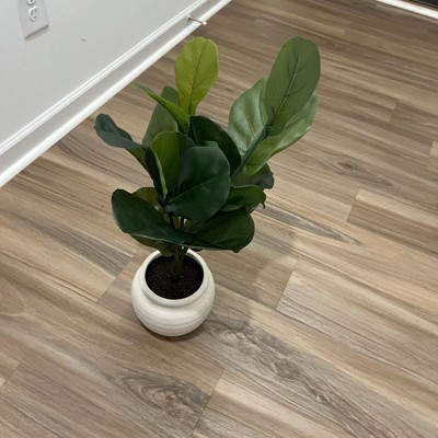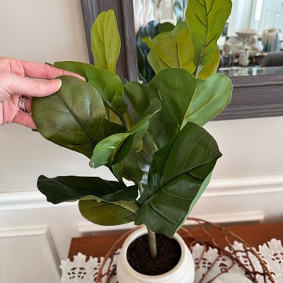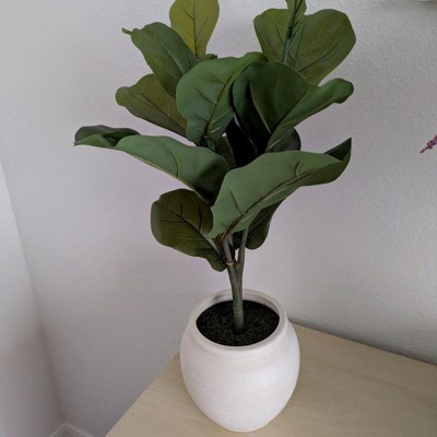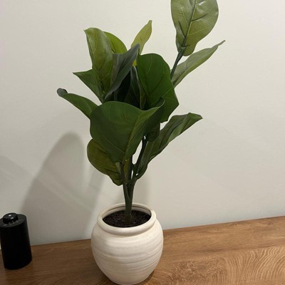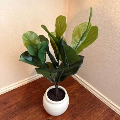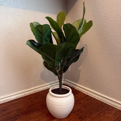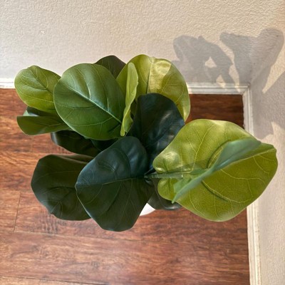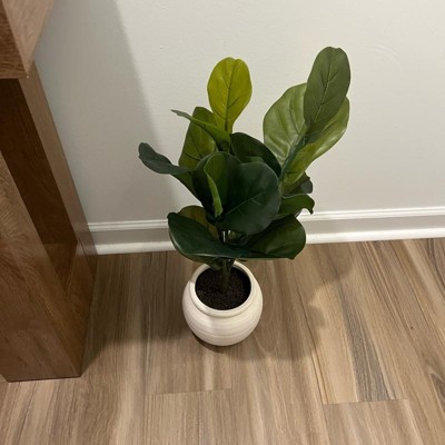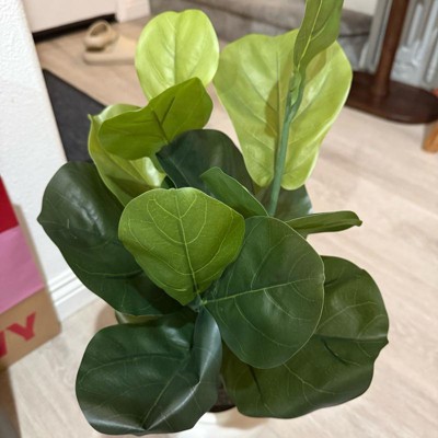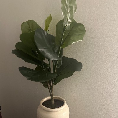 [This review was collected as part of a promotion.] I'm one of those people who just can't seem to keep any plants alive so I have artificial plants throughout my house, and this fiddle leaf plant is a great addition to my collection. The neutral white pot is lightweight but still sturdy. It measures 26" high so it would look good placed on the floor or on top of a table. From a distance you can't tell this is not a real plant, so make sure you don't accidentally water it!
