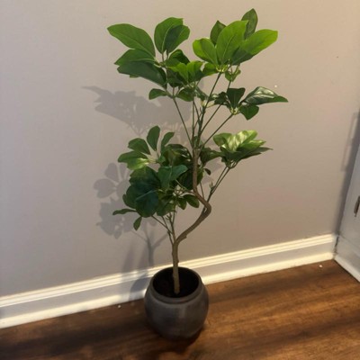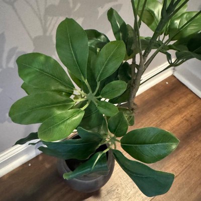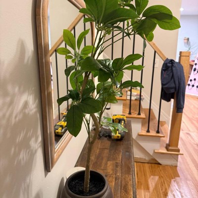 [This review was collected as part of a promotion.] This mini spade leaf tree is a great addition to my home decor and the perfect height for my console table at 26 inches tall. From a distance it is very realistic looking and adds a beautiful touch of greenery into the room. While it does appear a bit waxy as you get closer up, the overall effect is still very charming. I also especially love the appearance of the pot, which has a nice texture and color that compliments the tree perfectly.