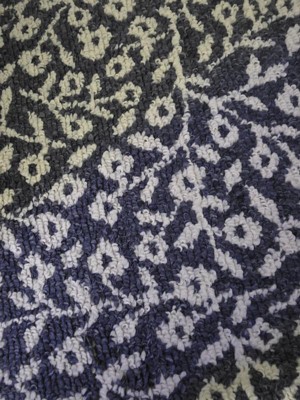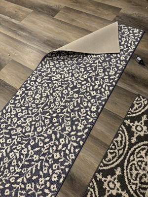 I have been using this rug runner in my kitchen near my sink and dishwasher. It has been great for me to stand on while I’m doing dishes. I also love that it prevents water from going on my tile and becoming slippery. I like that when needed, it can be washed in the washing machine. It is great quality and a beautiful rug. The color of the rug is a medium blue with off-white vines throughout the rug.
