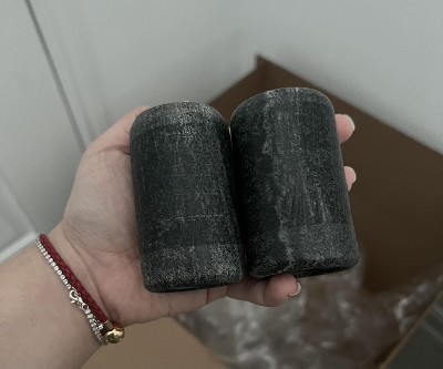 Really like these shakers. I keep them by the stove for cooking. The plastic wrap had an adhesive that discolored one of the shakers. A baking soda poultice cleaned the stone. I wanted to share in case anyone else has this issue!