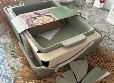 I bought this baking dish set because the color was cute 2 months ago, however after using it in the oven for a 20 minute in 400F the dish ruptured from one side to almost the other side when i was taking it out of the oven the items i had inside almost fell thankfully i had use aluminum foil so i did not have to worry about the broken dish in the food