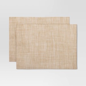 Spruce up the look of your table setting with this 2-Pack Heathered Placemat from Threshold™. Showcasing subtle heathered detailing in a tan color for a stylish look, these rectangular placemats create the perfect backdrop for any formal or casual table setting. The vinyl placemat set helps protect your surface against scratches, spills and messes. Pair it with coordinating napkins, table runners and more to complete the cohesive look.