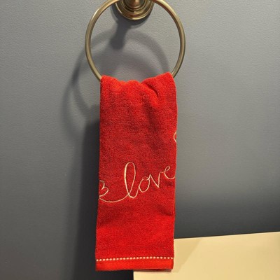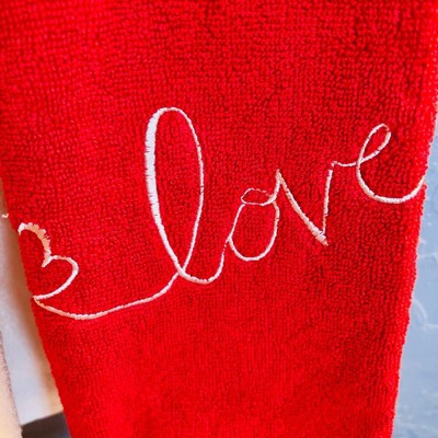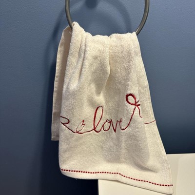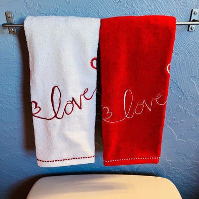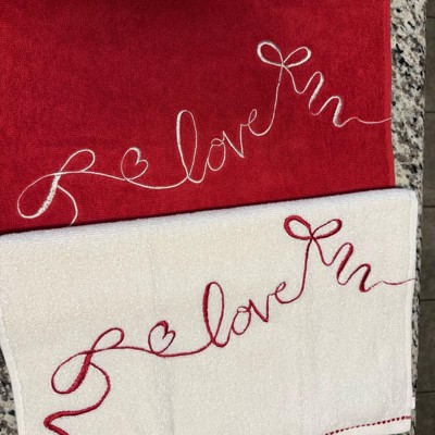 Liven up your bathroom decor with this 2-Pack Valentine's Day 'Love' Ribbon Hand Towel Set from Threshold™. This pack includes cream and red color plush hand towels, measuring 27 inches long x 16 inches wide. Made of 100% cotton terry fabric, these hand towels are super soft and absorbent, making them perfect for gently cleaning your face or body. Machine washable for easy cleaning, they're designed with a top loop for easy hanging.