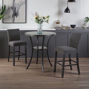 - 3-piece bar height dining set includes one bar table and 2 bar stools, highlighted with brass nail-heads for on-trend flair