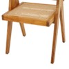 - Teak wood accent chair featuring a brown wooden structure furnished with exposed wood grain, chair arms that give support, long slender V-shaped legs, and comfortable woven seat and backrest